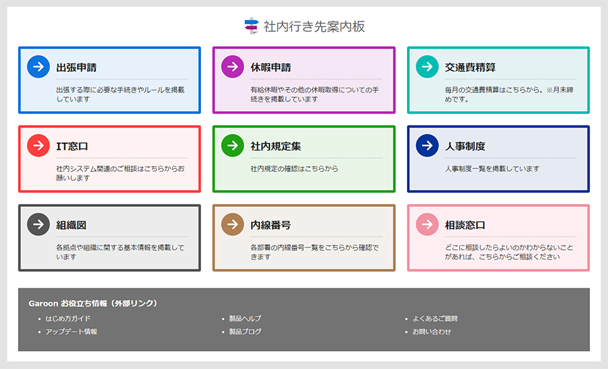 例えばサイボウズGaroonの「行き先案内板」テンプレートでは、申請書類や社内規程集などへのリンクをカラフルなパネル状のカードで一覧表示しています。パネルの背景色を明るく設定することで軽快で柔らかい印象になり、社内の各種手続きページへのリンク集を視覚的に分かりやすくまとめられます。