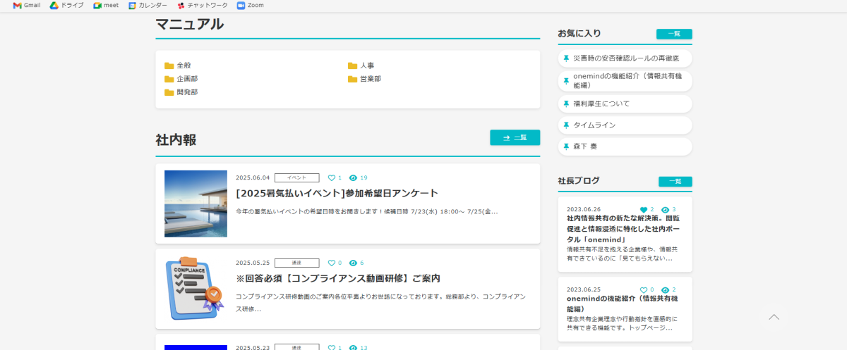 社内ポータルに盛り込みすぎな機能は不要で、シンプルさ重視のUIも中小企業には人気です。その代表例が「onemind(ワンマインド)」です。